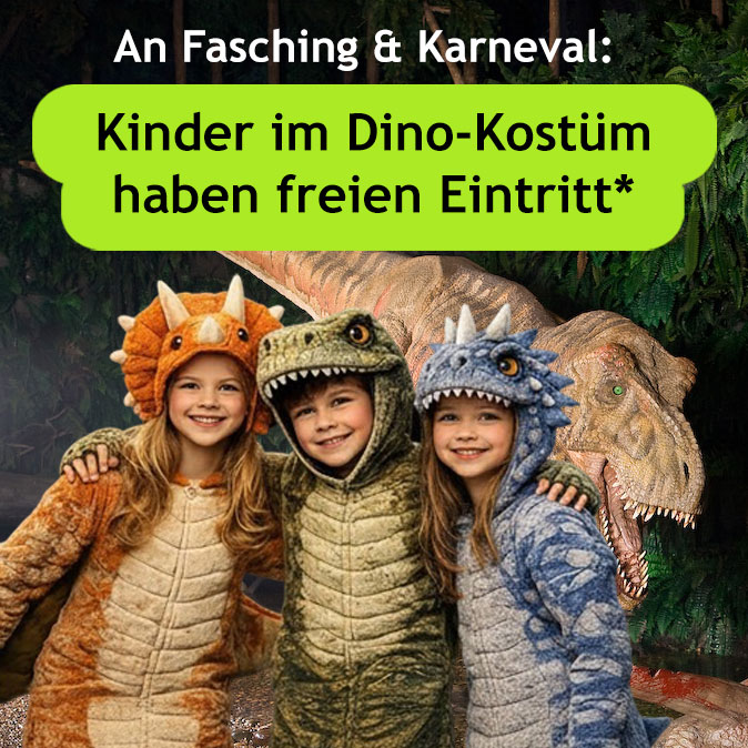 Alle Kinder von 3–17 Jahren, die an Fasching als Dinosaurier verkleidet kommen, erhalten freien Eintritt* – in Begleitung eines zahlenden Erwachsenen.